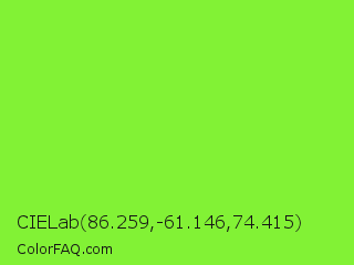 CIELab 86.259,-61.146,74.415 Color is a normal green color and the nearest color is Spring Frost #87ff2a. Hex code #82f235 and RGB value is rgb(130,242,53). In RGB color space, this color is composed of 51% red, 95% green, 21% blue, In CMYK color space, this color is composed of 46% cyan, 0% magenta, 78% yellow , 5% black , In HSL color space, this color has a hue angle of 96° , 88% saturation and 58% lightness.
