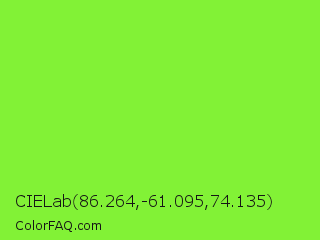 CIELab 86.264,-61.095,74.135 Color is a normal green color and the nearest color is Spring Frost #87ff2a. Hex code #82f236 and RGB value is rgb(130,242,54). In RGB color space, this color is composed of 51% red, 95% green, 21% blue, In CMYK color space, this color is composed of 46% cyan, 0% magenta, 78% yellow , 5% black , In HSL color space, this color has a hue angle of 96° , 88% saturation and 58% lightness.