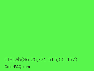 CIELab 86.26,-71.515,66.457 Color is a light green color and the nearest color is Screamin Green #66ff66. Hex code #58f64c and RGB value is rgb(88,246,76). In RGB color space, this color is composed of 35% red, 96% green, 30% blue, In CMYK color space, this color is composed of 64% cyan, 0% magenta, 69% yellow , 4% black , In HSL color space, this color has a hue angle of 116° , 90% saturation and 63% lightness.