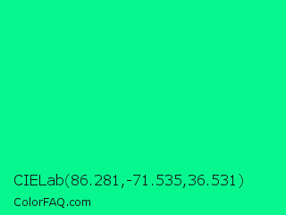 CIELab 86.281,-71.535,36.531 Color is a normal green color and the nearest color is Medium Spring Green #00fa9a. Hex code #07f78f and RGB value is rgb(7,247,143). In RGB color space, this color is composed of 3% red, 97% green, 56% blue, In CMYK color space, this color is composed of 97% cyan, 0% magenta, 42% yellow , 3% black , In HSL color space, this color has a hue angle of 154° , 94% saturation and 50% lightness.