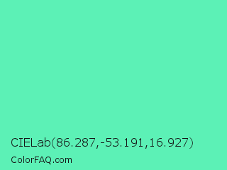 CIELab 86.287,-53.191,16.927 Color is a light green color and the nearest color is Medium Aquamarine #66ddaa. Hex code #5cf1b6 and RGB value is rgb(92,241,182). In RGB color space, this color is composed of 36% red, 95% green, 71% blue, In CMYK color space, this color is composed of 62% cyan, 0% magenta, 24% yellow , 5% black , In HSL color space, this color has a hue angle of 156° , 84% saturation and 65% lightness.