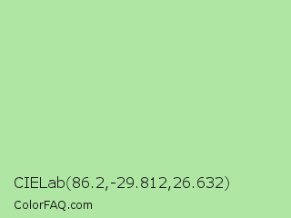 CIELab 86.2,-29.812,26.632 Color is a light green color and the nearest color is Granny Smith Apple #a8e4a0. Hex code #afe6a4 and RGB value is rgb(175,230,164). In RGB color space, this color is composed of 69% red, 90% green, 64% blue, In CMYK color space, this color is composed of 24% cyan, 0% magenta, 29% yellow , 10% black , In HSL color space, this color has a hue angle of 110° , 57% saturation and 77% lightness.