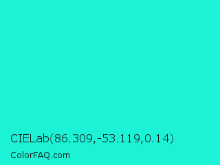 CIELab 86.309,-53.119,0.14 Color is a normal cyan color and the nearest color is Bright Turquoise #08e8de. Hex code #1cf2d6 and RGB value is rgb(28,242,214). In RGB color space, this color is composed of 11% red, 95% green, 84% blue, In CMYK color space, this color is composed of 88% cyan, 0% magenta, 12% yellow , 5% black , In HSL color space, this color has a hue angle of 172° , 89% saturation and 53% lightness.