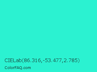 CIELab 86.316,-53.477,2.785 Color is a normal cyan color and the nearest color is Turquoise #40e0d0. Hex code #2bf2d1 and RGB value is rgb(43,242,209). In RGB color space, this color is composed of 17% red, 95% green, 82% blue, In CMYK color space, this color is composed of 82% cyan, 0% magenta, 14% yellow , 5% black , In HSL color space, this color has a hue angle of 170° , 88% saturation and 56% lightness.