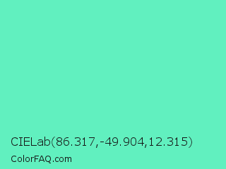 CIELab 86.317,-49.904,12.315 Color is a light green color and the nearest color is Medium Aquamarine #66ddaa. Hex code #61f0bf and RGB value is rgb(97,240,191). In RGB color space, this color is composed of 38% red, 94% green, 75% blue, In CMYK color space, this color is composed of 60% cyan, 0% magenta, 20% yellow , 6% black , In HSL color space, this color has a hue angle of 159° , 83% saturation and 66% lightness.
