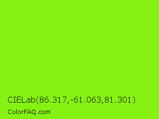 CIELab 86.317,-61.063,81.301 Color is a normal green color and the nearest color is Lawn Green #7cfc00. Hex code #86f214 and RGB value is rgb(134,242,20). In RGB color space, this color is composed of 53% red, 95% green, 8% blue, In CMYK color space, this color is composed of 45% cyan, 0% magenta, 92% yellow , 5% black , In HSL color space, this color has a hue angle of 89° , 90% saturation and 51% lightness.