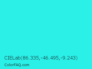 CIELab 86.335,-46.495,-9.243 Color is a normal cyan color and the nearest color is Loeen #15f2fd. Hex code #2bf0e8 and RGB value is rgb(43,240,232). In RGB color space, this color is composed of 17% red, 94% green, 91% blue, In CMYK color space, this color is composed of 82% cyan, 0% magenta, 3% yellow , 6% black , In HSL color space, this color has a hue angle of 178° , 87% saturation and 55% lightness.