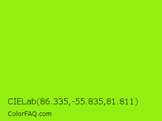 CIELab 86.335,-55.835,81.811 Color is a normal green color and the nearest color is Spring Bud #a7fc00. Hex code #94f012 and RGB value is rgb(148,240,18). In RGB color space, this color is composed of 58% red, 94% green, 7% blue, In CMYK color space, this color is composed of 38% cyan, 0% magenta, 93% yellow , 6% black , In HSL color space, this color has a hue angle of 85° , 88% saturation and 51% lightness.