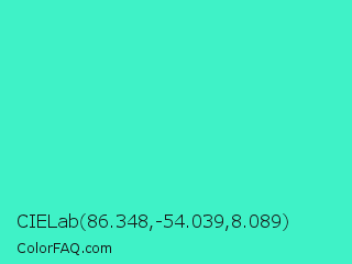 CIELab 86.348,-54.039,8.089 Color is a normal cyan color and the nearest color is Turquoise #40e0d0. Hex code #3ff2c7 and RGB value is rgb(63,242,199). In RGB color space, this color is composed of 25% red, 95% green, 78% blue, In CMYK color space, this color is composed of 74% cyan, 0% magenta, 18% yellow , 5% black , In HSL color space, this color has a hue angle of 166° , 87% saturation and 60% lightness.
