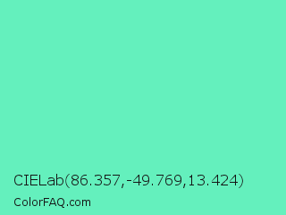 CIELab 86.357,-49.769,13.424 Color is a light green color and the nearest color is Medium Aquamarine #66ddaa. Hex code #64f0bd and RGB value is rgb(100,240,189). In RGB color space, this color is composed of 39% red, 94% green, 74% blue, In CMYK color space, this color is composed of 58% cyan, 0% magenta, 21% yellow , 6% black , In HSL color space, this color has a hue angle of 158° , 82% saturation and 67% lightness.