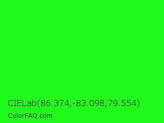 CIELab 86.374,-83.098,79.554 Color is a normal green color and the nearest color is Neon Green #39ff14. Hex code #1ffa1a and RGB value is rgb(31,250,26). In RGB color space, this color is composed of 12% red, 98% green, 10% blue, In CMYK color space, this color is composed of 88% cyan, 0% magenta, 90% yellow , 2% black , In HSL color space, this color has a hue angle of 119° , 96% saturation and 54% lightness.