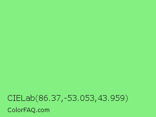 CIELab 86.37,-53.053,43.959 Color is a light green color and the nearest color is Light Green #90ee90. Hex code #83f081 and RGB value is rgb(131,240,129). In RGB color space, this color is composed of 51% red, 94% green, 51% blue, In CMYK color space, this color is composed of 45% cyan, 0% magenta, 46% yellow , 6% black , In HSL color space, this color has a hue angle of 119° , 79% saturation and 72% lightness.