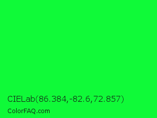 CIELab 86.384,-82.6,72.857 Color is a normal green color and the nearest color is Malachite #0bda51. Hex code #0ffa38 and RGB value is rgb(15,250,56). In RGB color space, this color is composed of 6% red, 98% green, 22% blue, In CMYK color space, this color is composed of 94% cyan, 0% magenta, 78% yellow , 2% black , In HSL color space, this color has a hue angle of 130° , 96% saturation and 52% lightness.