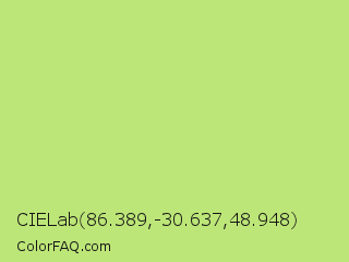 CIELab 86.389,-30.637,48.948 Color is a light green color and the nearest color is Yellow Green #c5e17a. Hex code #bde678 and RGB value is rgb(189,230,120). In RGB color space, this color is composed of 74% red, 90% green, 47% blue, In CMYK color space, this color is composed of 18% cyan, 0% magenta, 48% yellow , 10% black , In HSL color space, this color has a hue angle of 82° , 69% saturation and 69% lightness.