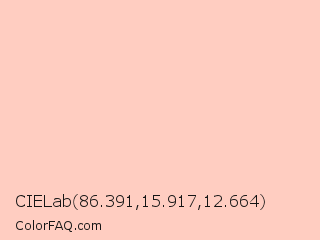 CIELab 86.391,15.917,12.664 Color is a very light red color and the nearest color is Your Pink #ffc3c0. Hex code #ffcdc1 and RGB value is rgb(255,205,193). In RGB color space, this color is composed of 100% red, 80% green, 76% blue, In CMYK color space, this color is composed of 0% cyan, 20% magenta, 24% yellow , 0% black , In HSL color space, this color has a hue angle of 12° , 100% saturation and 88% lightness.