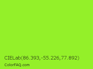CIELab 86.393,-55.226,77.892 Color is a normal green color and the nearest color is Spring Frost #87ff2a. Hex code #94f029 and RGB value is rgb(148,240,41). In RGB color space, this color is composed of 58% red, 94% green, 16% blue, In CMYK color space, this color is composed of 38% cyan, 0% magenta, 83% yellow , 6% black , In HSL color space, this color has a hue angle of 88° , 87% saturation and 55% lightness.