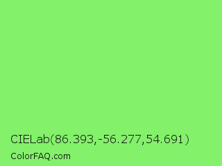 CIELab 86.393,-56.277,54.691 Color is a light green color and the nearest color is Pastel Green #77dd77. Hex code #83f16a and RGB value is rgb(131,241,106). In RGB color space, this color is composed of 51% red, 95% green, 42% blue, In CMYK color space, this color is composed of 46% cyan, 0% magenta, 56% yellow , 5% black , In HSL color space, this color has a hue angle of 109° , 83% saturation and 68% lightness.