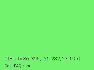 CIELab 86.396,-61.282,53.195 Color is a light green color and the nearest color is Screamin Green #66ff66. Hex code #72f36d and RGB value is rgb(114,243,109). In RGB color space, this color is composed of 45% red, 95% green, 43% blue, In CMYK color space, this color is composed of 53% cyan, 0% magenta, 55% yellow , 5% black , In HSL color space, this color has a hue angle of 118° , 85% saturation and 69% lightness.