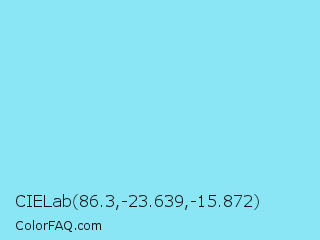 CIELab 86.3,-23.639,-15.872 Color is a light cyan color and the nearest color is Medium Sky Blue #80daeb. Hex code #8ae6f5 and RGB value is rgb(138,230,245). In RGB color space, this color is composed of 54% red, 90% green, 96% blue, In CMYK color space, this color is composed of 44% cyan, 6% magenta, 0% yellow , 4% black , In HSL color space, this color has a hue angle of 188° , 84% saturation and 75% lightness.