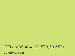 CIELab 86.404,-22.579,50.653 Color is a light lime color and the nearest color is Yellow Green #c5e17a. Hex code #cee275 and RGB value is rgb(206,226,117). In RGB color space, this color is composed of 81% red, 89% green, 46% blue, In CMYK color space, this color is composed of 9% cyan, 0% magenta, 48% yellow , 11% black , In HSL color space, this color has a hue angle of 71° , 65% saturation and 67% lightness.