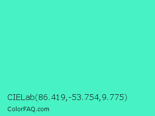 CIELab 86.419,-53.754,9.775 Color is a light cyan color and the nearest color is Turquoise #40e0d0. Hex code #47f2c4 and RGB value is rgb(71,242,196). In RGB color space, this color is composed of 28% red, 95% green, 77% blue, In CMYK color space, this color is composed of 71% cyan, 0% magenta, 19% yellow , 5% black , In HSL color space, this color has a hue angle of 164° , 87% saturation and 61% lightness.