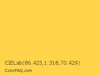 CIELab 86.425,1.318,70.429 Color is a light yellow color and the nearest color is Gargoyle Gas #ffdf46. Hex code #ffd44a and RGB value is rgb(255,212,74). In RGB color space, this color is composed of 100% red, 83% green, 29% blue, In CMYK color space, this color is composed of 0% cyan, 17% magenta, 71% yellow , 0% black , In HSL color space, this color has a hue angle of 46° , 100% saturation and 65% lightness.