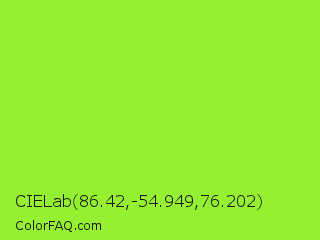 CIELab 86.42,-54.949,76.202 Color is a normal green color and the nearest color is French Lime #9efd38. Hex code #94f030 and RGB value is rgb(148,240,48). In RGB color space, this color is composed of 58% red, 94% green, 19% blue, In CMYK color space, this color is composed of 38% cyan, 0% magenta, 80% yellow , 6% black , In HSL color space, this color has a hue angle of 89° , 86% saturation and 56% lightness.