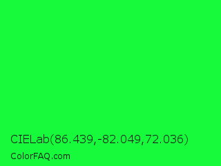 CIELab 86.439,-82.049,72.036 Color is a normal green color and the nearest color is Malachite #0bda51. Hex code #17fa3b and RGB value is rgb(23,250,59). In RGB color space, this color is composed of 9% red, 98% green, 23% blue, In CMYK color space, this color is composed of 91% cyan, 0% magenta, 76% yellow , 2% black , In HSL color space, this color has a hue angle of 130° , 96% saturation and 54% lightness.