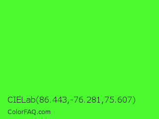 CIELab 86.443,-76.281,75.607 Color is a normal green color and the nearest color is Neon Green #39ff14. Hex code #4cf82f and RGB value is rgb(76,248,47). In RGB color space, this color is composed of 30% red, 97% green, 18% blue, In CMYK color space, this color is composed of 69% cyan, 0% magenta, 81% yellow , 3% black , In HSL color space, this color has a hue angle of 111° , 93% saturation and 58% lightness.