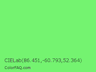 CIELab 86.451,-60.793,52.364 Color is a light green color and the nearest color is Screamin Green #66ff66. Hex code #73f36f and RGB value is rgb(115,243,111). In RGB color space, this color is composed of 45% red, 95% green, 44% blue, In CMYK color space, this color is composed of 53% cyan, 0% magenta, 54% yellow , 5% black , In HSL color space, this color has a hue angle of 118° , 85% saturation and 69% lightness.
