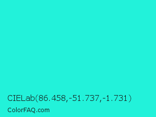 CIELab 86.458,-51.737,-1.731 Color is a normal cyan color and the nearest color is Bright Turquoise #08e8de. Hex code #22f2da and RGB value is rgb(34,242,218). In RGB color space, this color is composed of 13% red, 95% green, 85% blue, In CMYK color space, this color is composed of 86% cyan, 0% magenta, 10% yellow , 5% black , In HSL color space, this color has a hue angle of 173° , 89% saturation and 54% lightness.