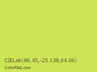 CIELab 86.45,-25.138,64.06 Color is a light yellow color and the nearest color is Maximum Green Yellow #d9e650. Hex code #cfe357 and RGB value is rgb(207,227,87). In RGB color space, this color is composed of 81% red, 89% green, 34% blue, In CMYK color space, this color is composed of 9% cyan, 0% magenta, 62% yellow , 11% black , In HSL color space, this color has a hue angle of 69° , 71% saturation and 62% lightness.