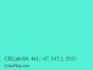 CIELab 86.461,-47.347,1.505 Color is a light cyan color and the nearest color is Turquoise #40e0d0. Hex code #53f0d4 and RGB value is rgb(83,240,212). In RGB color space, this color is composed of 33% red, 94% green, 83% blue, In CMYK color space, this color is composed of 65% cyan, 0% magenta, 12% yellow , 6% black , In HSL color space, this color has a hue angle of 169° , 84% saturation and 63% lightness.