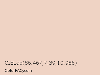 CIELab 86.467,7.39,10.986 Color is a very light orange color and the nearest color is Almond #eed9c4. Hex code #efd3c4 and RGB value is rgb(239,211,196). In RGB color space, this color is composed of 94% red, 83% green, 77% blue, In CMYK color space, this color is composed of 0% cyan, 12% magenta, 18% yellow , 6% black , In HSL color space, this color has a hue angle of 21° , 57% saturation and 85% lightness.
