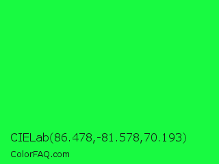CIELab 86.478,-81.578,70.193 Color is a normal green color and the nearest color is Malachite #0bda51. Hex code #18fa41 and RGB value is rgb(24,250,65). In RGB color space, this color is composed of 9% red, 98% green, 25% blue, In CMYK color space, this color is composed of 90% cyan, 0% magenta, 74% yellow , 2% black , In HSL color space, this color has a hue angle of 131° , 96% saturation and 54% lightness.