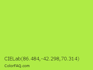 CIELab 86.484,-42.298,70.314 Color is a normal green color and the nearest color is Conifer #acdd4d. Hex code #afeb45 and RGB value is rgb(175,235,69). In RGB color space, this color is composed of 69% red, 92% green, 27% blue, In CMYK color space, this color is composed of 26% cyan, 0% magenta, 71% yellow , 8% black , In HSL color space, this color has a hue angle of 82° , 81% saturation and 60% lightness.