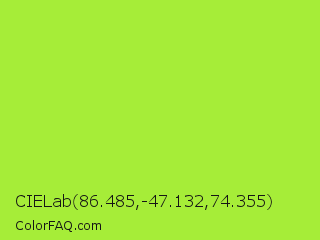 CIELab 86.485,-47.132,74.355 Color is a normal green color and the nearest color is Green Lizard #a7f432. Hex code #a6ed38 and RGB value is rgb(166,237,56). In RGB color space, this color is composed of 65% red, 93% green, 22% blue, In CMYK color space, this color is composed of 30% cyan, 0% magenta, 76% yellow , 7% black , In HSL color space, this color has a hue angle of 84° , 83% saturation and 57% lightness.