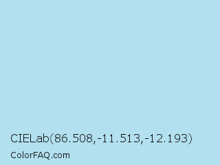 CIELab 86.508,-11.513,-12.193 Color is a very light blue color and the nearest color is Blizzard Blue #ace5ee. Hex code #b2e0ef and RGB value is rgb(178,224,239). In RGB color space, this color is composed of 70% red, 88% green, 94% blue, In CMYK color space, this color is composed of 26% cyan, 6% magenta, 0% yellow , 6% black , In HSL color space, this color has a hue angle of 195° , 66% saturation and 82% lightness.