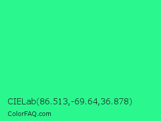 CIELab 86.513,-69.64,36.878 Color is a normal green color and the nearest color is Medium Spring Green #00fa9a. Hex code #2bf78f and RGB value is rgb(43,247,143). In RGB color space, this color is composed of 17% red, 97% green, 56% blue, In CMYK color space, this color is composed of 83% cyan, 0% magenta, 42% yellow , 3% black , In HSL color space, this color has a hue angle of 149° , 93% saturation and 57% lightness.