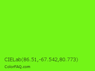 CIELab 86.51,-67.542,80.773 Color is a normal green color and the nearest color is Lawn Green #7cfc00. Hex code #73f517 and RGB value is rgb(115,245,23). In RGB color space, this color is composed of 45% red, 96% green, 9% blue, In CMYK color space, this color is composed of 53% cyan, 0% magenta, 91% yellow , 4% black , In HSL color space, this color has a hue angle of 95° , 92% saturation and 53% lightness.