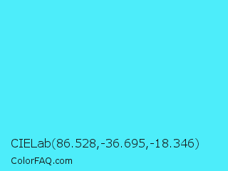 CIELab 86.528,-36.695,-18.346 Color is a light cyan color and the nearest color is Turquoise Blue #6cdae7. Hex code #4dedfa and RGB value is rgb(77,237,250). In RGB color space, this color is composed of 30% red, 93% green, 98% blue, In CMYK color space, this color is composed of 69% cyan, 5% magenta, 0% yellow , 2% black , In HSL color space, this color has a hue angle of 185° , 95% saturation and 64% lightness.