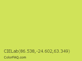 CIELab 86.538,-24.602,63.349 Color is a light yellow color and the nearest color is Maximum Green Yellow #d9e650. Hex code #d0e359 and RGB value is rgb(208,227,89). In RGB color space, this color is composed of 82% red, 89% green, 35% blue, In CMYK color space, this color is composed of 8% cyan, 0% magenta, 61% yellow , 11% black , In HSL color space, this color has a hue angle of 68° , 71% saturation and 62% lightness.