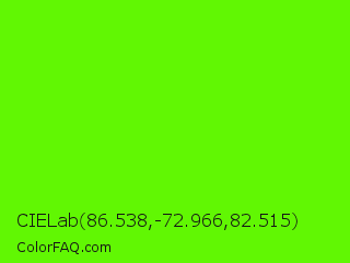 CIELab 86.538,-72.966,82.515 Color is a normal green color and the nearest color is Bright Green #66ff00. Hex code #61f703 and RGB value is rgb(97,247,3). In RGB color space, this color is composed of 38% red, 97% green, 1% blue, In CMYK color space, this color is composed of 61% cyan, 0% magenta, 99% yellow , 3% black , In HSL color space, this color has a hue angle of 97° , 98% saturation and 49% lightness.