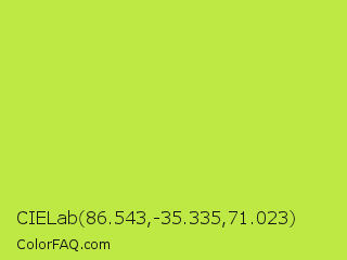 CIELab 86.543,-35.335,71.023 Color is a normal lime color and the nearest color is Conifer #acdd4d. Hex code #bee844 and RGB value is rgb(190,232,68). In RGB color space, this color is composed of 75% red, 91% green, 27% blue, In CMYK color space, this color is composed of 18% cyan, 0% magenta, 71% yellow , 9% black , In HSL color space, this color has a hue angle of 75° , 78% saturation and 59% lightness.
