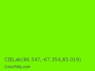 CIELab 86.547,-67.354,83.019 Color is a normal green color and the nearest color is Lawn Green #7cfc00. Hex code #75f500 and RGB value is rgb(117,245,0). In RGB color space, this color is composed of 46% red, 96% green, 0% blue, In CMYK color space, this color is composed of 52% cyan, 0% magenta, 100% yellow , 4% black , In HSL color space, this color has a hue angle of 91° , 100% saturation and 48% lightness.