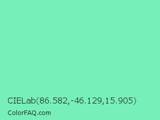 CIELab 86.582,-46.129,15.905 Color is a light green color and the nearest color is Bermuda #7dd8c6. Hex code #77efb9 and RGB value is rgb(119,239,185). In RGB color space, this color is composed of 47% red, 94% green, 73% blue, In CMYK color space, this color is composed of 50% cyan, 0% magenta, 23% yellow , 6% black , In HSL color space, this color has a hue angle of 153° , 79% saturation and 70% lightness.
