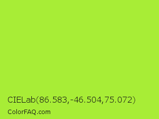 CIELab 86.583,-46.504,75.072 Color is a normal green color and the nearest color is Green Lizard #a7f432. Hex code #a8ed36 and RGB value is rgb(168,237,54). In RGB color space, this color is composed of 66% red, 93% green, 21% blue, In CMYK color space, this color is composed of 29% cyan, 0% magenta, 77% yellow , 7% black , In HSL color space, this color has a hue angle of 83° , 84% saturation and 57% lightness.