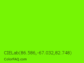 CIELab 86.586,-67.032,82.748 Color is a normal green color and the nearest color is Lawn Green #7cfc00. Hex code #76f504 and RGB value is rgb(118,245,4). In RGB color space, this color is composed of 46% red, 96% green, 2% blue, In CMYK color space, this color is composed of 52% cyan, 0% magenta, 98% yellow , 4% black , In HSL color space, this color has a hue angle of 92° , 97% saturation and 49% lightness.