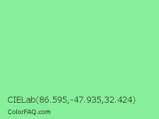 CIELab 86.595,-47.935,32.424 Color is a light green color and the nearest color is Light Green #90ee90. Hex code #87ef99 and RGB value is rgb(135,239,153). In RGB color space, this color is composed of 53% red, 94% green, 60% blue, In CMYK color space, this color is composed of 44% cyan, 0% magenta, 36% yellow , 6% black , In HSL color space, this color has a hue angle of 130° , 76% saturation and 73% lightness.