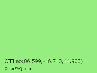 CIELab 86.599,-46.713,44.903 Color is a light green color and the nearest color is Light Green #90ee90. Hex code #96ee80 and RGB value is rgb(150,238,128). In RGB color space, this color is composed of 59% red, 93% green, 50% blue, In CMYK color space, this color is composed of 37% cyan, 0% magenta, 46% yellow , 7% black , In HSL color space, this color has a hue angle of 108° , 76% saturation and 72% lightness.